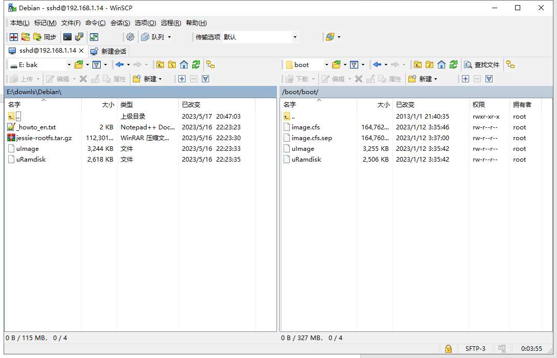 使用WinSCP登录mycloud,将下载的文件jessie-rootfs.tar.gz、uImage、uRamdisk上传至/boot/boot目录。